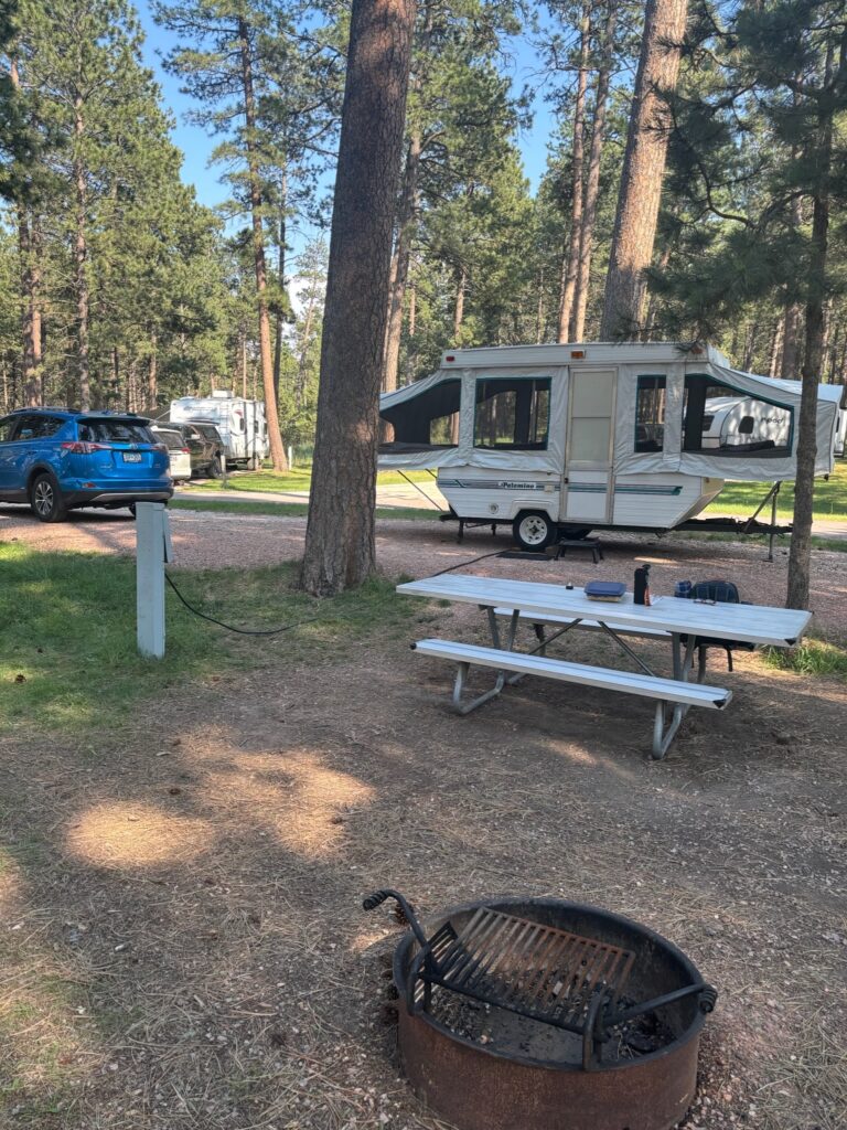 Our overnight stop was at the KOA campground in the Badlands. I would have preferred, naturally, to stay at a campground within the national park, but there had been no availability when I was planning the trip, so KOA would have to do. Incidentally, this was the KOA that I had intended to stay at on my way home from Yellowstone on my last (2021) trip (the only other time that I have ever made the drive between home and Yellowstone (albeit in the other direction) via South Dakota rather than North Dakota), before car trouble ended up stranding me in Rapid City. Unlike their North Dakota counterpart, South Dakota’s Badlands can’t really be seen from the interstate, so I didn’t even end up getting to see them on that trip. So, when we left the interstate and ventured onto the Badlands loop road on this evening, it was (as noted earlier) my first time seeing them since 1996, and Emily’s first time ever. We were both duly impressed, but we were also in a hurry to get to the campground, since the sun was already low in the sky. Indeed, we did wind up setting up in the dark (and as a result, I didn’t take a picture of our first night’s campsite at all). I still made a fire and cooked the hobo dinners that I had prepared at home, though, so that was good.