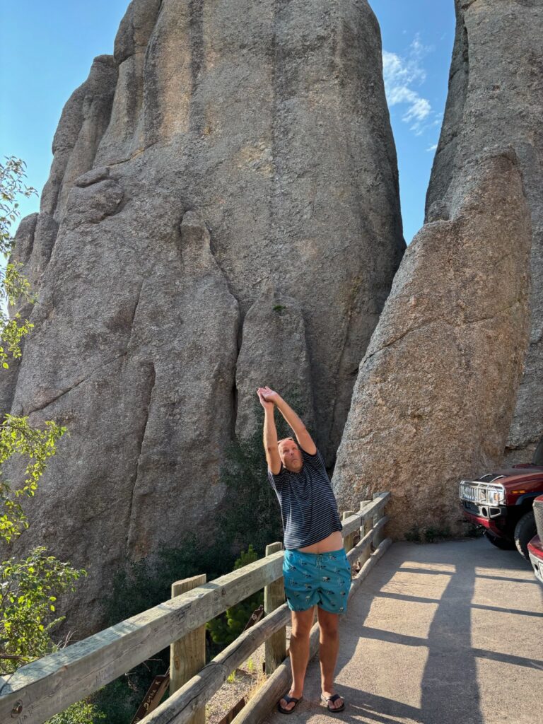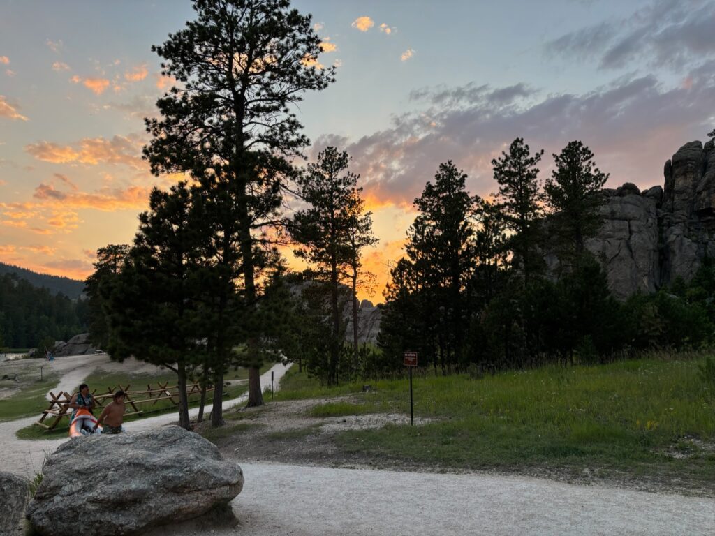 I’m pretty sure that my parents and siblings (or at least some of them?) harbor fond memories that I, mostly, don’t, of a family visit (probably during the 1992 Black Hills trip, which I was along for but maybe a bit checked out from?) to Sylvan Lake. I know that I’ve heard at least some family members reminisce about it over the years, anyway. Also, I believe that some of my sibs have been there since, with their families. For myself, I had a general notion of it being a cool place, but not much in the way of direct memories of it. Well, I do now! It is, indeed, a beautiful (and fun!) spot. After enjoying the needles, we drove the rest of the way there, claimed a picnic table, and ate our dinner. The sun was already starting to set by the time we were done eating, and we fretted a little about how late we had let it get before getting into the water, but we needn’t have; it seemed cold as we were wading in, but once we went for it, it actually felt wonderful. We swam out to, and around, the big rock formations in the lake, and had a blast!