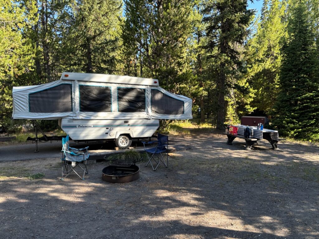 The drive from Cody to Yellowstone, which takes about an hour, does also go through mountains (the Absarokas), and this was the part of the drive that I did remember from 2021. It’s beautiful country, and my excitement was getting pretty high as we finally neared Yellowstone, but also, we were tired from traveling and eager to get there (and, once again, looking at a lamentably late arrival time; in fact, we had grabbed a Taco John’s dinner in Cody, knowing that we would not be making it to the campground until well past any vaguely reasonable dinnertime). When we reached the park entrance, we found it not even staffed (too late in the day already, I guess), and it crossed our minds to wonder what the situation would be like when we got to our campground (but we’d just have to cross that bridge when we came to it, we figured). We’d be staying at Grant, so from the east entrance, our route took us west (duh) to the shores of Yellowstone Lake, then around a significant chunk of said lake as we proceeded to Fishing Bridge and then down the main (southern) loop road to where the road to the south entrance (and the Tetons) forks off. Yet again, it was fully dark by the time we finally rolled into Grant Village; happily, though, the campground office was still open. After being assigned a site (in Loop I, for the record—an area of the campground that the woman behind the window assured us was lovely), we got to have the “fun” of trying to back the camper into said site in the dark (something we’d been spared when setting up in the dark two nights before, in the Badlands, where we’d had a pull-thru site). We managed it, though, and got ourselves set up and put to bed as quickly as we could. We were in Yellowstone!