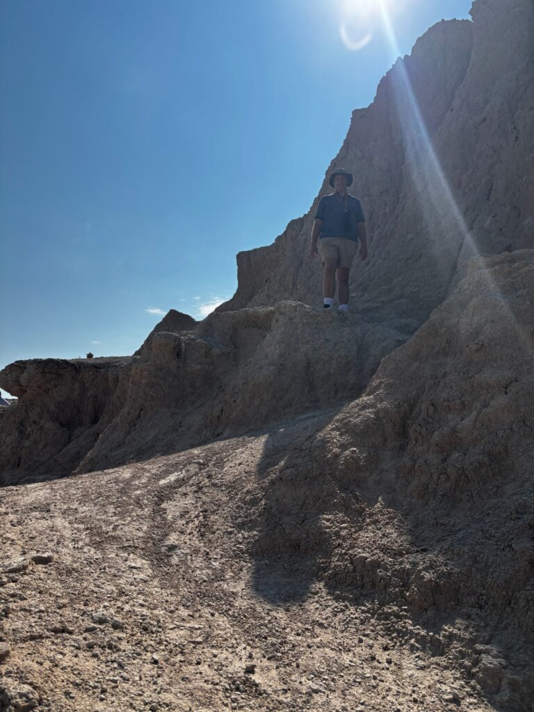 The following morning, we started the day with some Badlands sightseeing and hiking! We didn’t have a vast amount of time to spend at this—partly because we had other goals for the day, but even more so because we opted to leave Lucinda (i.e. the camper) behind, but of course would need to get back to the campsite and retrieve her before checkout time. So, after a stop at the visitor center for information, we decided to hike the Cliff Shelf Nature Trail (described as less than a mile round-trip, consisting of a combination of boardwalks and “natural paths” that climb 200 feet along “the Badlands Wall”). We soon discovered that there were various little (unofficial?) mini-trails branching off from the main trail, and we explored some of these. Juniper trees were everywhere, and things were generally badlandy. It was fun! Afterwards, we still had a little time, so we drove a little farther “back” up the loop road to a parking area that serves two very short and very popular boardwalk-type trails known as “Door Trail” and “Window Trail.” If I’m not mistaken, we walked “Window Trail.” Here, the scenery was even more breathtaking than on the previous trail.