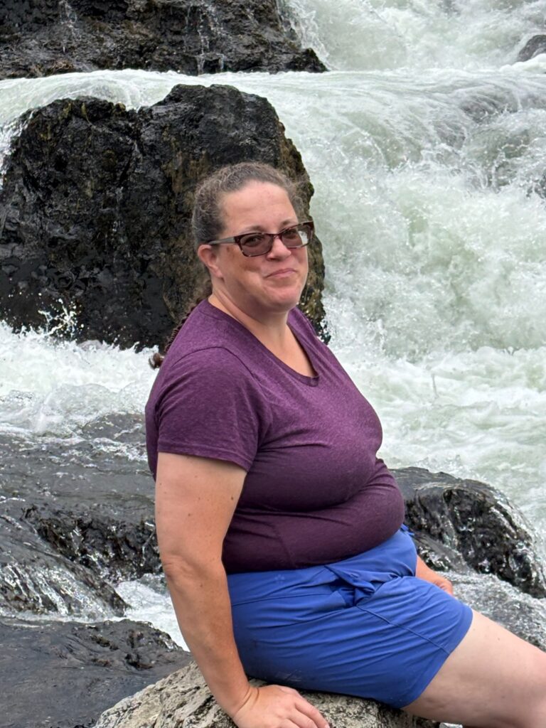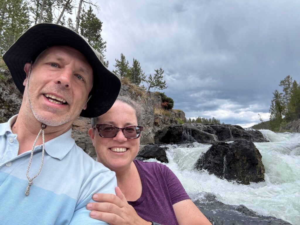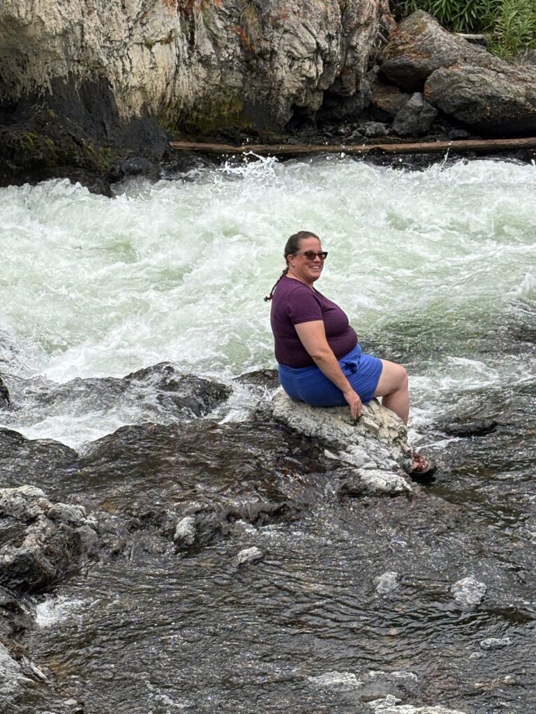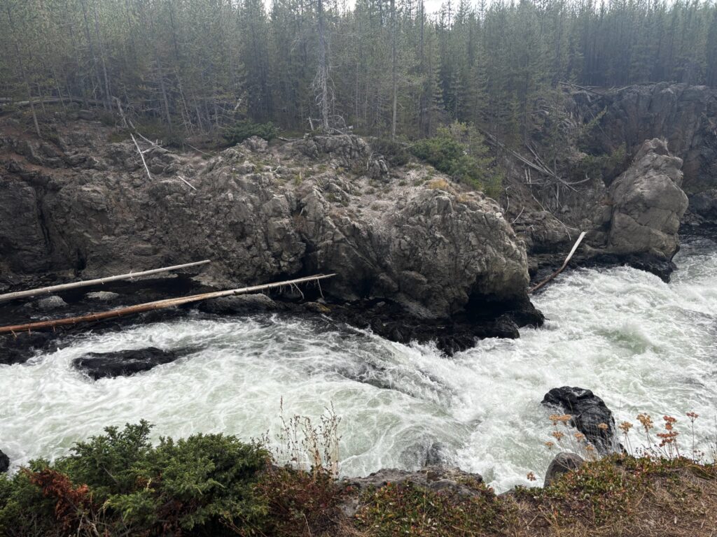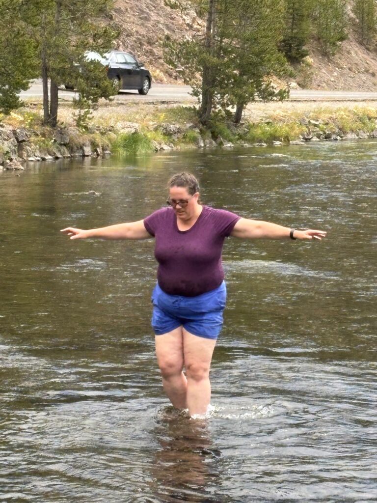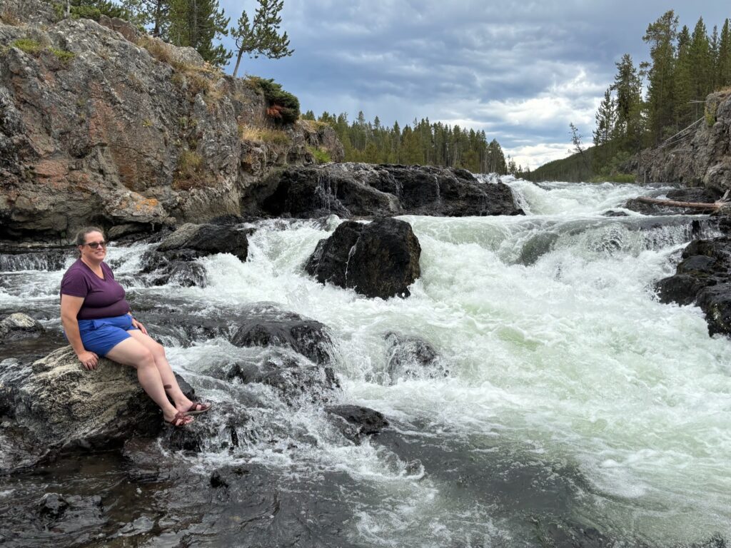 After chancing into a second eruption of Old Faithful as we made our way back to the visitor center, we hopped back in the car and drove up the main loop road to Firehole Canyon Drive. I really thought that the last week of July would be late enough in the season for the swimming spot to be open, but alas—it wasn’t! (Maybe you really do have to wait until August for that; to be sure, the one and only time that I have ever gotten to swim there, it was mid-August.) Of course, the scenery along Firehole Canyon Drive was still spectacular…and also, undaunted, we made our own fun. On my last trip out there, in 2021, I had similarly found the swimming spot closed, and I had dealt with it by finding a place along the main loop road some distance to the south where I could still swim in the Firehole River. That was cool, but the spot had kind of been nothing special. This time, Emily and I pulled off the main road just south of where Firehole Canyon Drive spits you back out onto the main road (meaning just upstream of Firehole Canyon), at a spot where the river is considerably wilder (rocky, with rapids and small waterfalls) than where I had swum in it four years ago. One couldn’t “swim” here, per se, but one could certainly “adventure” in the river! First, we found an awesome perch on some rocks up above the river and ate a picnic lunch; then, we carefully made our way into the water and started exploring!