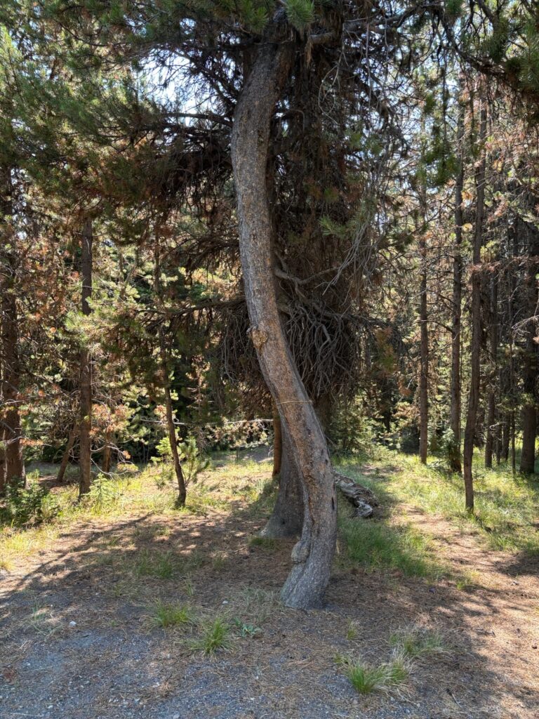 The hike itself is 4.8 miles “out and back” (so roughly 2.4 miles each way), with the trailhead being located sort of “behind” the Midway Geyser Basin area (whose boardwalk we had visited the previous day). Much as I had done for my overnight hike four years ago, we parked well to the south of the Midway Geyser Basin proper (in an “overflow” parking area at the side of the main loop road), then walked along the Firehole River, crossed it via the footbridge, and headed around “behind” the thermal features to a path that leads both to the scenic overlook trail for Grand Prismatic Spring (which we bypassed) and to the Fairy Falls trail. Once you reach the trail proper, it’s a delightful and easy hike on a wide, flat, sandy path surrounded by relatively young lodgepole pines—until right before you reach the falls, when the terrain gets suddenly more rugged (and there are lots of fallen trees and stuff).