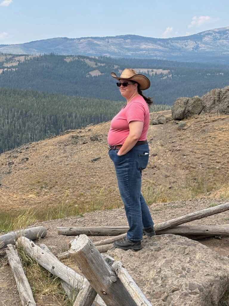 Then, continuing north past the Canyon area and onto the upper (northern) loop road, we drove through Dunraven Pass. I had sort of half-forgotten just how mountainous, switchbacky, and generally beautiful this part of the northern loop road (between Canyon and Tower-Roosevelt) is, partly because it had been closed for construction during my most recent previous trip to Yellowstone (2021). (That’s not much of an excuse, though, really; I’d driven this way numerous times on prior trips.) It is, in fact, the highest-elevation portion of either of the loop roads in the park. We paused at a scenic overlook spot, but only took one photo: