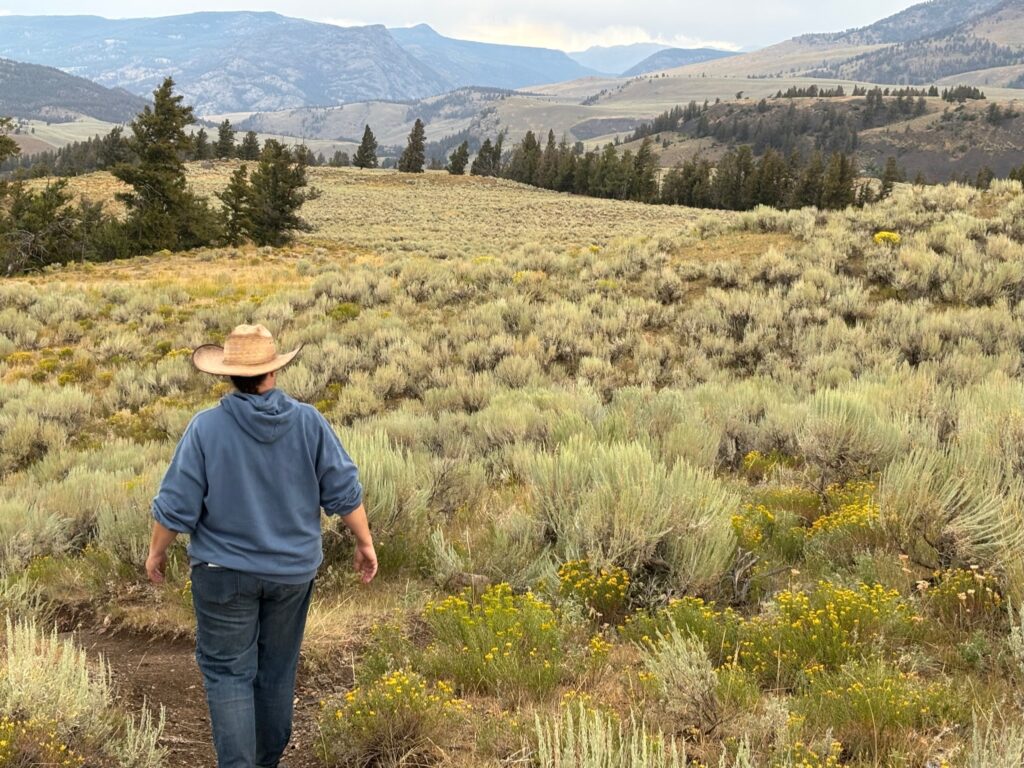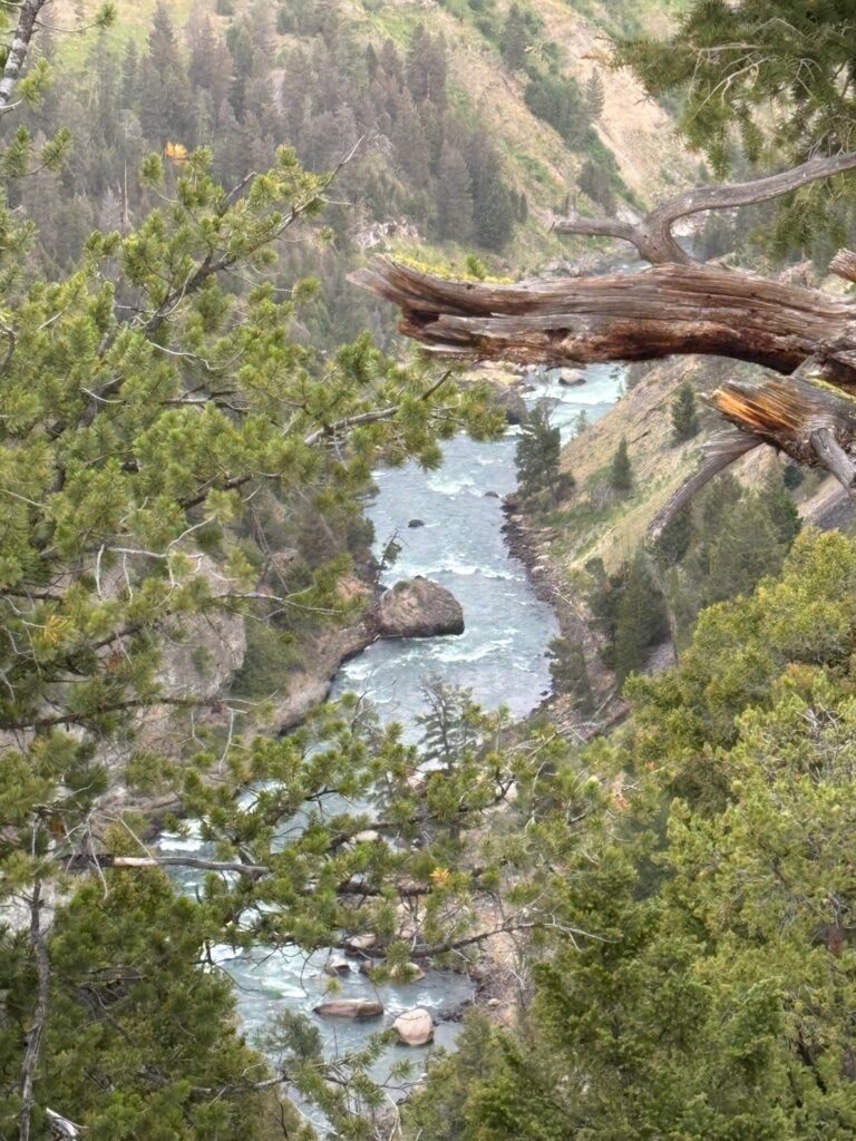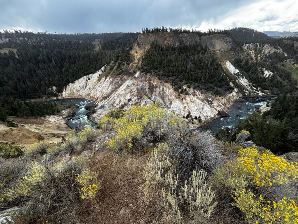 Said trail begins with a short but steep climb up to a high ridge overlooking the Yellowstone River, now some ways downstream from the Grand Canyon thereof but still looking awesomely scenic. The trail then runs along said ridge for about two miles, after which we would have the options of either turning around and retracing our steps, or taking another trail that ours would meet up with, which (if we went left on it) would lead us back to a different trailhead a short ways up the northeast entrance road, from which we could then take a roadside path back to our trailhead and picnic area. (Alternatively, turning right at this T-fork would have meant committing to Specimen Ridge Trail, which my hiking book describes as “not for the faint-hearted or poorly conditioned; a long, strenuous late-season day trip with incredible scenery and an opportunity to use your route-finding skills. Maybe not for us.)