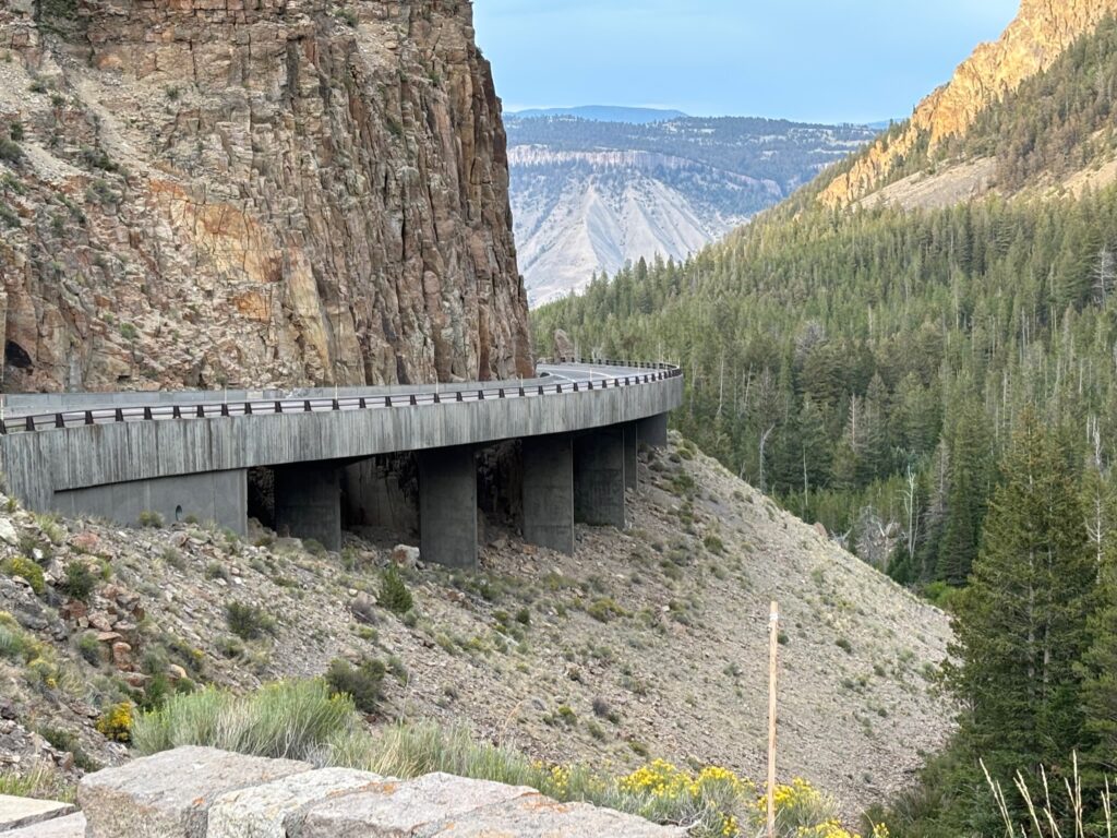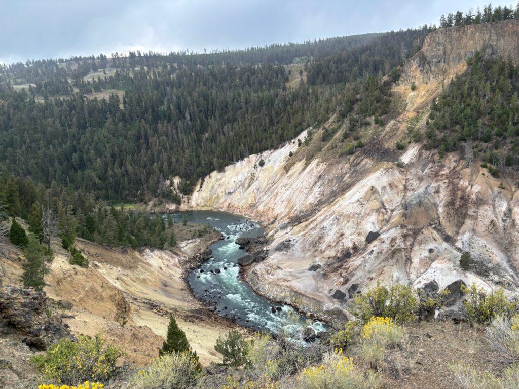 By the time we were done looking around here, it was not only cold and windy and rainy, but also getting kind of late. We were hungry, and we had a long drive ahead of us to get back to our campground…and Mammoth is the most “developed” area of the park; it’s an actual little community where park staff live and stuff, on top of its touristy nature (being located, after all, just south of the park’s main entrance). All this to say that there are restaurants, and we decided to dine at one. There’s both a fancy-ish sit-down type place and a more fast-food type option; we checked out the former first, but they were extremely busy, so rather than waiting for a table, we settled for the latter. Then, after dinner, we set off down the west side of the northern loop road toward “home.” Our travels for the day thus ended up consisting of a big oval around the entirely of the park’s two loop roads, omitting only the “connecting” segment in the middle that makes the loops into a kind of big figure 8. The last part of our drive back to the campground took us back through the geyser basin-y, Firehole Rirver-y areas that we had spent the previous two days in—but before that, there were the Mammoth to Norris and Norris to Madison stretches. This is an area that I spent more time in on my 2014 trip (again, the one that I remember the least well) than I have on any of my other visits to Yellowstone. I dimly remembered there being a cool spot along the Mammoth to Norris part of the drive where there was a turnout from which you could maybe see a waterfall and stuff (real specific, I know). When I thought I might be seeing what I was remembering, we pulled over. The spot is called “Golden Gate Canyon,” and there’s a sign there describing how building the road/bridge through it was one of the most difficult engineering challenges involved in the early era of building roads through the park.