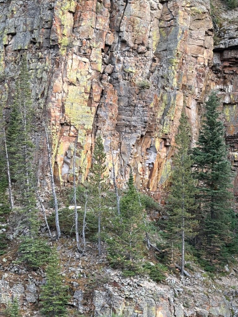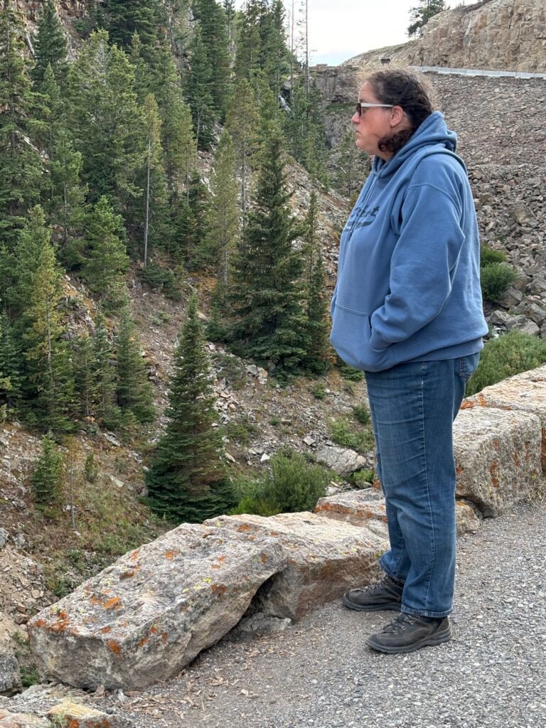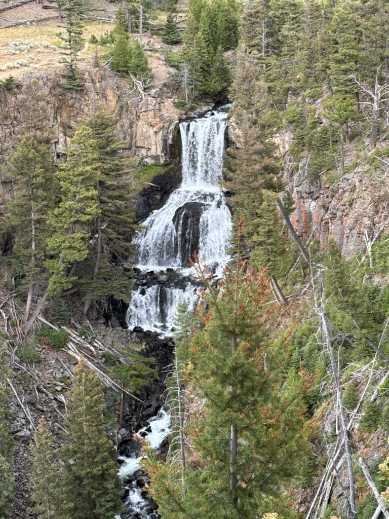 After this hike, we returned to the car and continued our way around the upper loop. There’s another trail up there that I had originally thought to possibly explore part of, but we decided to skip that and head for the Boiling River instead. This is a spot (north of Mammoth, near the north/main park entrance) where hot springs dump super-hot water into the very cold Gardner River; the hot and cold waters mix and produce hot-tub-like temps in a small contained area surrounded by rocks. I’ve only ever been there once (it’s another area that’s often closed during the first part of summer, for one thing), on my 2016 solo trip (in the evening, after I had gone whitewater rafting up in Gardiner during the day). Unfortunately, we did not end up getting to experience the Boiling River today/on this trip…but I’m getting ahead of myself. First, en route to Mammoth, we stopped to see the petrified tree (cool, but more conceptually than visually; we took no photos (though I’ve got at least one from a prior trip)); then, farther along the road from Tower to Mammoth, we pulled off at a turnout to admire a waterfall called Undine Falls. I’m pretty sure this was one view that I had never stopped to look at before, unlike the majority of the stuff that we did at Yellowstone.