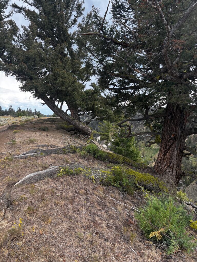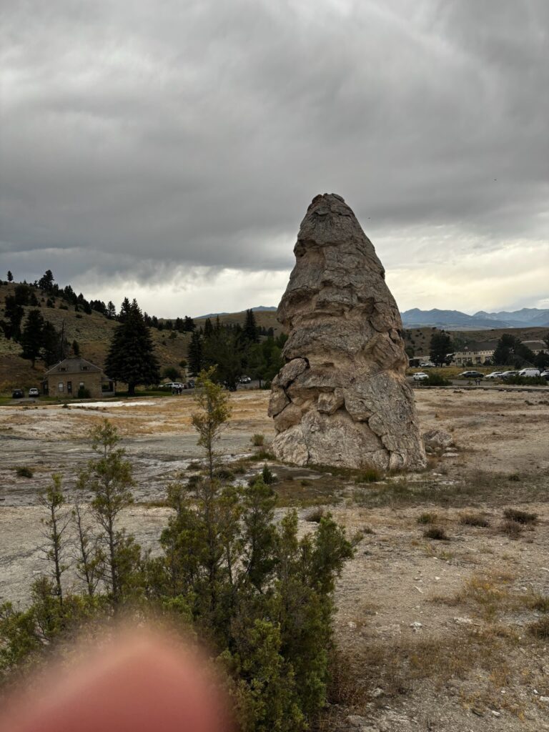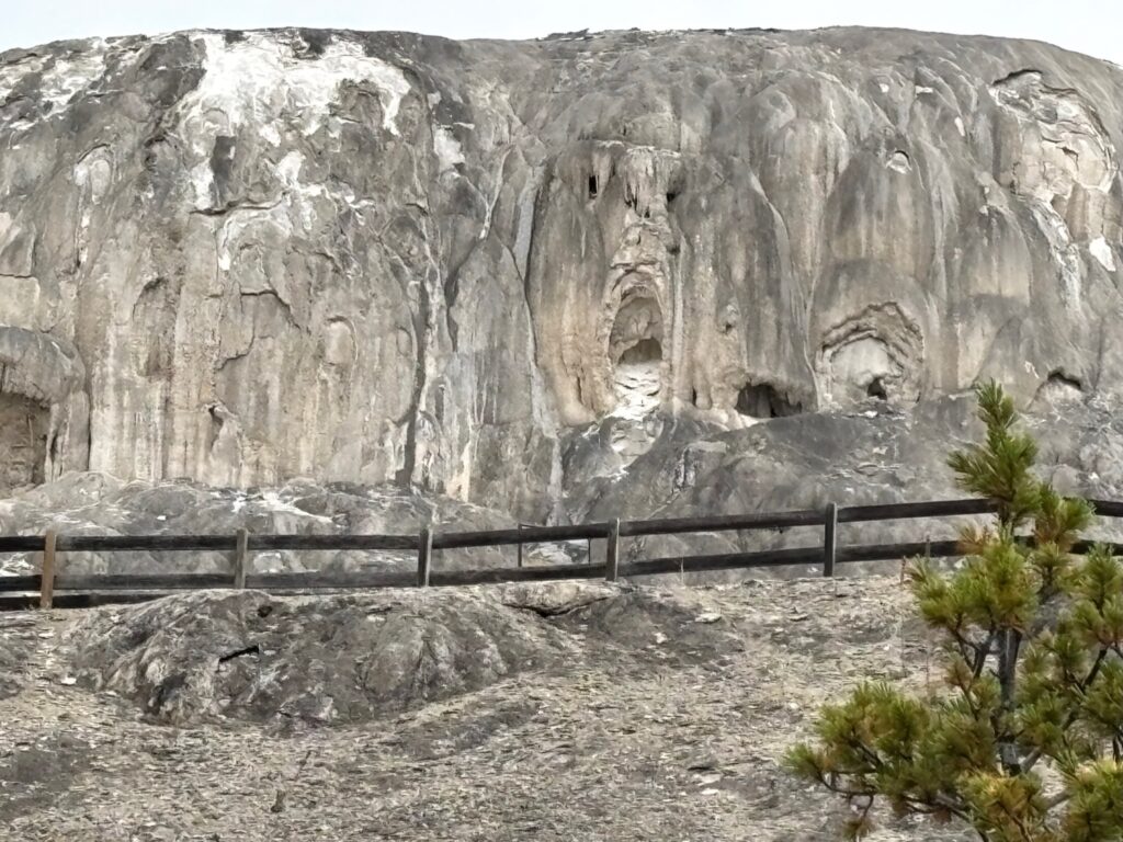After passing through Mammoth, we drove all the way up to the north entrance (it’s not very far) without spotting the Boiling River parking area, which puzzled me, since I remember (and my trail book confirms) that it was located along this stretch of road. But then I vaguely remembered my brother Ted (who’d been out there at least once since my last trip) telling me that something had changed about the access to this spot after the massive flooding that wreaked havoc on the northwestern portion of the park in 2022. In fact, that flooding (I now know) wiped out whole sections of the north entrance road as I formerly knew it, and the road that exists now is actually just a temporary road (built by making improvements to an older road that had not been in use for some time). As we drove back to Mammoth, with Emily poking around on the internet via her phone and me trying to put observations together with vague memories, we did figure part of this out (though we imagined that what we were on was an entirely new road). The internet made it look like there was still a way to get to the Boiling River, but if that’s true, we were unable to figure it out. (I actually think we may simply have been getting directions that assumed the the old road still existed.) Anyway, we gave up on that and instead spent some time exploring the travertine (that is, Limestone!) terraces in the Mammoth area. Honestly, this is a part of the park that (limestone or no) I have never been quite as attached to as I am to most other parts. Jen and I did spend some time here in 2014 (and had also made a very brief stop on our way out of the park on our first trip, in 2009), but I’d pretty much given it a miss on every trip since (until now). That said, it’s not like there’s nothing cool or interesting to be seen there (though it appears that we didn’t get any good photos of the actual travertine terraces for which the area is best known)…