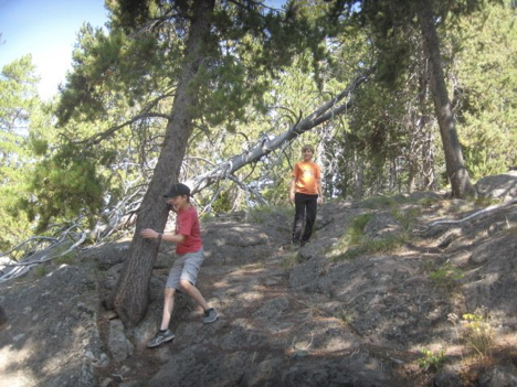 Not far into our stroll along the boardwalks, though, we came to the spot where you can turn off onto an unpaved trail that goes up onto some higher ground in the woods, leading to “Observation Point” (from which you can see Old Faithful from above) and Solitary Geyser. Zane enthusiastically voted for this trail, so that’s where we ended up going (uphill AGAIN!). We didn’t make it to Observation Point in time, but we were still able to watch Old Faithful go off from the trail itself. I didn’t take any pictures of that, but I did take some of Zane and Bram goofing around along the trail.