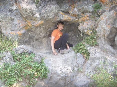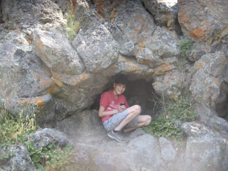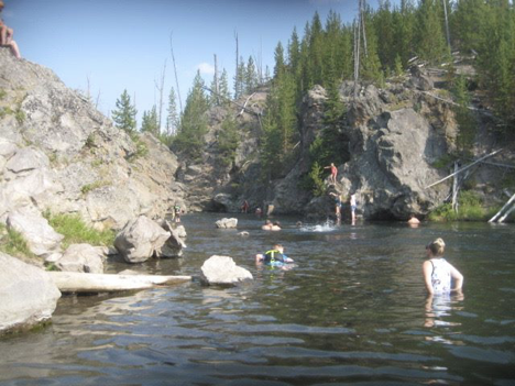 So, back to the present: Here I was, 9 years after that initial trip when I’d been disappointed not to be able to check out the swimming spot, and this afternoon seemed like the right time to finally rectify the situation! It was hot, we were tired, the spot wasn’t too far away, and it just seemed like the thing to do. Unfortunately, Carl and family had not brought swimming stuff along when setting out this morning (I, of course, had, having learned on past trips to be prepared for anything at all times), which meant that they would only be able to wade in, not actually go swimming (about which the boys—especially my main swimming buddy Bram—were disappointed)…but even so, it still seemed like the thing to do. Mom and Dad, who had not yet lunched, headed off to a picnic area with plans to maybe, or maybe not, meet up with the rest of us later, and we all (Bram riding with me, and talking my ear off the whole way) headed for Firehole Canyon Drive.