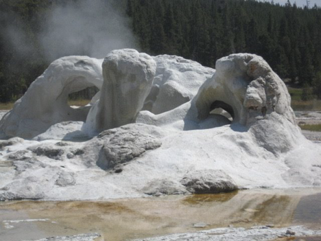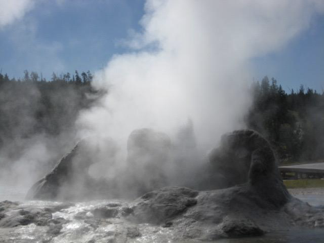 Following a lunch in the parking lot, it was decided that Carl and family would briefly visit the gift shop, then get out their bikes and ride the paved trail along the edge of the Old Faithful area that leads out to Morning Glory, while I would set out immediately on foot for the same destination, via the boardwalks. I didn’t meander, linger over the sights, or take many pictures en route, since I’ve already got multiple collections of pictures of the many thermal features here—but I did make a point of checking out one of my favorites, Grotto Geyser: