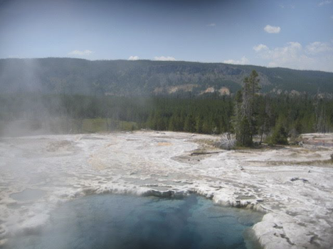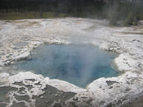 When I reached Morning Glory, I ran into Mom and Dad, and we chatted for a bit. I think I took a picture of them, with their camera, but no pictures of my own. Inevitably, though, I started reliving the story that I wrote about my experience at this spot two years ago—how I’d overheard some loudmouth know-it-all assuring his companions that here it was, Morning Glory, the best thing to see in the park, or some such, and then I’d walked a few minutes down a trail that leads away from the boardwalks and encountered a hot spring that looked like what I imagine Morning Glory may have looked like in the years before vandalism altered it, and I’d experienced a sort of transcendent moment. Mom expressed interest in seeing what I had seen, so she and I set off along the trail. Also inevitably, however, it proved to be rather a longer walk than I’d remembered (though still less than 10 minutes), and with enough trail hazards along the way that Mom ended up turning back. I had to go on and see it again for myself, though—and when I did, I found that the spot still sent a shiver down my spine.