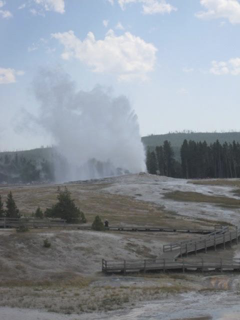 So, the plan for the morning of “geyser day” was for me to drive down to Fishing Bridge (the RV park) to meet up with everyone else, and for us all to then drive (in our separate vehicles, to keep options open) around to the Upper Geyser Basin (aka the Old Faithful area). I duly drove down to Fishing Bridge in the morning, only to realize that no one had told me what sites they were in. I checked in the office, but it turned out that they also had not thought to leave info for me there—and the employees wouldn’t give out site numbers without permission, of course. Argh. So, I was reduced to driving the loops, trying to spot vehicles, campers, or people that I recognized—which did eventually get me there, if somewhat behind schedule. We all then took off for the Upper Geyser Basin, in our separate cars…without thinking to agree on a spot to meet up again when we got there (the area being a large and usually very crowded one). So, between a latish start and these various failures of communication and coordination, it was very late morning by the time we were all finally together in the Old Faithful Visitor Center and discussing how to proceed. Mom and Dad had already been here and seen Old Faithful earlier in the week, and they were of a mind to head out onto the boardwalks toward Morning Glory (which is at the farthest point reachable via boardwalks). Carl and family, naturally, wanted to see Old Faithful erupt, which it was expected to do in a half-hour or so. So they (with me accompanying) decided to stroll the closer portions of the boardwalk while waiting for Old Faithful, while Mom and Dad began their trek out toward Morning Glory. We would then have some lunch, after which we would make our way out toward Morning Glory ourselves.