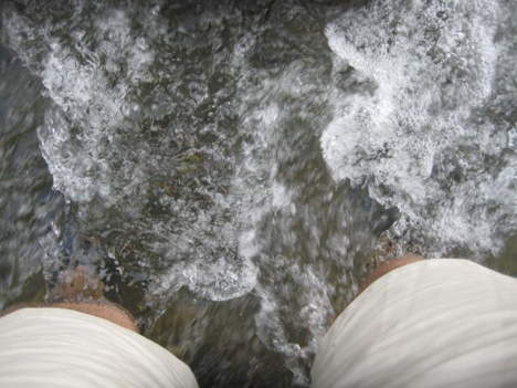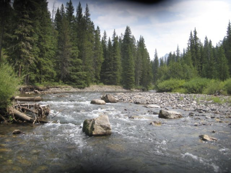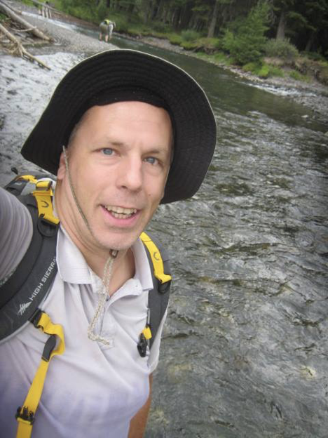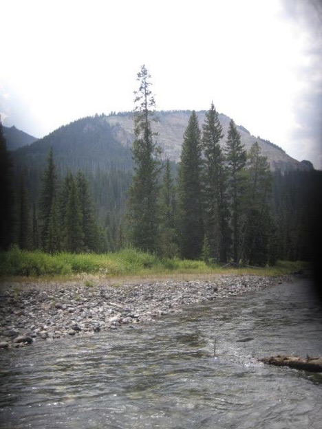 Upon reaching Yellowstone, I stopped at the Warm Creek picnic area that I remembered well from two years ago (just two miles or so past the northeast entrance) to have my lunch, much as I had done last time. (I also indulged in the obligatory wade into the creek after eating, to verify that it still failed to live up to its name.) Then I headed to the trailhead for my intended hike, which was about 8 miles farther down the road. The trail was one that I had identified last time as potentially fun (mostly, I guess, because it involved fording a creek, with which I am weirdly obsessed), but because it’s located way up near the northeast corner of the park, it would be very inconvenient and time-consuming to get to from the campground—hence my idea of getting to the park early enough in the day to do this hike on my way in, BEFORE getting to the campground, since it was right on my route this way. Ominously, as I pulled into the parking area at the trailhead, the sky began rumbling, and a few raindrops started falling. “I should have known better than to tempt fate by choosing a trail called ‘The Thunderer’!” I thought (even if that DOES mean that it shares its name with a John Phillip Sousa march). But I got out my rain gear and put it on, and this seemed to scare the potential rainstorm away, so—that was good. I got myself ready, packed my hiking pack, and set off—and it turned out that that creek (namely Soda Butte Creek, which name, yes, became the basis for various juvenile jokes later on) was so close to the trailhead that I ought to have just started out wearing my water shoes. Oh, well; even if having to stop so soon to change footwear was unexpected, the creek-fording was still fun!