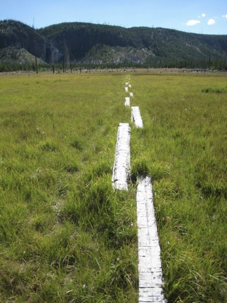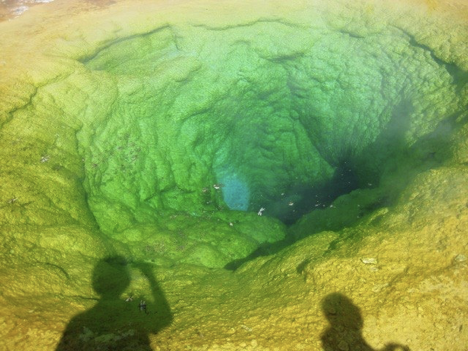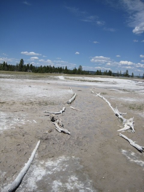But that was just fine, because the hike turned out to be a pretty great one (probably my favorite of the whole trip, in fact). Parts of it went past some back country thermal features, some of which were hard to pick a path around; the trail would become unclear and seem to lead right through the runoff from a hot spring, across terrain that I would normally feel obliged to avoid (see below)—but fun!