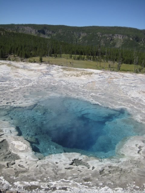 So, like I said, Morning Glory is kind of at the end of the farthest boardwalk…but you can go on still further. There’s no more boardwalk, but a bone fide hiking trail begins nearby and heads into some “back country” (more or less) and past some additional (named) thermal features (and then onward to another area if you go far enough). I decided to explore this trail at least far enough to see the couple of named springs that my area map showed just down the trail. And that’s how, maybe three minutes’ walk beyond Morning Glory, I came upon what to me was an even more stunning hot spring. Morning Glory, for all its beauty, is said to be “fading” somewhat; the intense blue coloring for which it is famous is now less intense than it once was (and only covers part of the spring), due to changes resulting mainly from vandalism (people throw stuff in, it blocks the “plumbing” and prevents circulation, the temperature goes down, and different organisms that like the lower temperatures and that produce different colors take up residence). Anyway, this other spring was more stunningly, intensely blue than Morning Glory currently is, and the view of it from the peaceful and secluded trail (very different from the crowded boardwalks that I’d just left behind) was looking down from above, into its depths—with a panoramic vista of mountains and trees as a backdrop, and a waning half-moon hanging in the sky overhead. Upon taking in this scene, I suddenly experienced a second moment rather like the one that I’d had right after entering the park on the previous day: a sort of breathless-yet-calm moment of pure joy. Wow.