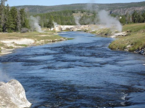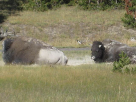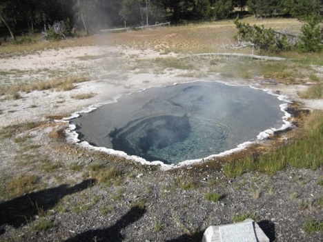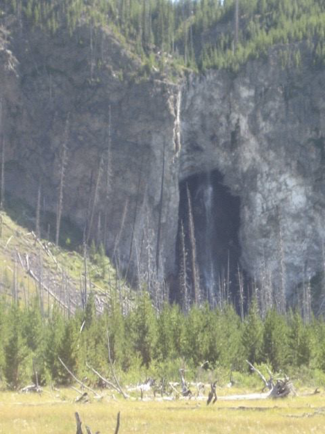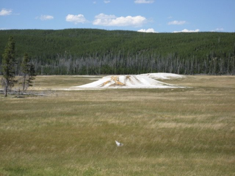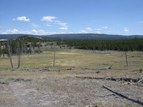 That, then, was the first half of my day. Leaving the Old Faithful area, I was in search of a nice picnic spot and more than ready to escape crowds (and, once I was in the car trying to thread my way out of the area, quite eager to escape traffic as well). Alas, there was a bit of a mishap here. Shortly after turning out onto the main road heading north, as I was passing the turnoff for Midway Geyser Basin (I think that was where it was, at least), a vehicle two or three cars ahead of me slammed very suddenly on the breaks, causing a chain reaction of cars lurching to a stop. Unfortunately, the driver ahead of me slammed on his break at the precise second when I had turned my head to the side, just for an instant, trying to read a sign or something. When I turned face forward again, I was careening toward a stopped car way too quickly (even though I really wasn’t going very fast at all; it was a bit of a traffic jam, with everyone basically crawling along). So, I rear-ended the vehicle in front of me. It was just a fender-bender; no one was hurt, and my car wasn’t damaged…but there was some slight damage visible to the other car’s rear bumper, and I’m afraid of what it’s going to do to my insurance premiums. But he was very understanding about it, we exchanged insurance info, and I moved on and didn’t dwell. I ended up at Whiskey Flats, the picnic area that Jen and had I stopped at multiple times on a previous Yellowstone trip, for lunch.