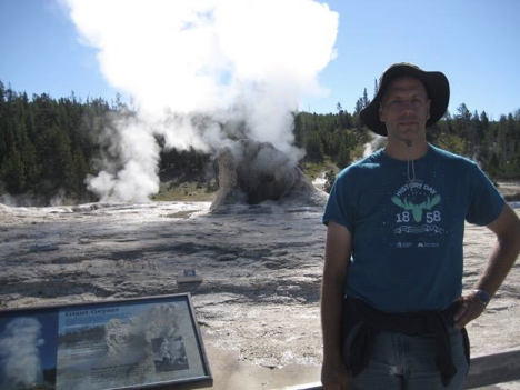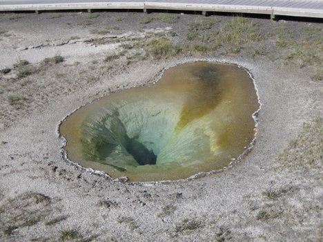 Among the other people who were near Morning Glory at the same time that I was, there was a guy who was saying to someone he was with that it had to be “pretty much the premier hot spring to see here,” or words to that effect—spoken not in awed tones, as though he were actually deeply impressed by it, but in matter-of-fact tones, as though mostly in deference to it being something that he’d heard of before, or something. Even so, I half-agreed with the sentiment in one sense; Morning Glory is, indeed, a really pretty sight, after all—even more so than many of the others. But I also thought it a pretty sweeping and (without meaning to be overly judgmental) sort of ignorant comment, especially if by “here” he meant in the entire park (I mean, for starters, ever heard of something called Grand Prismatic Spring?). Yellowstone’s a big park, with a lot to see (even limiting ourselves just to hot springs for the moment), I thought to myself—and just because something is named, famous, and on an easily accessible boardwalk doesn’t mean it’s automatically the best. Though of course, the boardwalks and visitor centers and whatnot do tend to get built to provide access to as many of the most impressive sights as possible, so…but whatever. Point is, to my mind this guy didn’t really know what he was talking about.